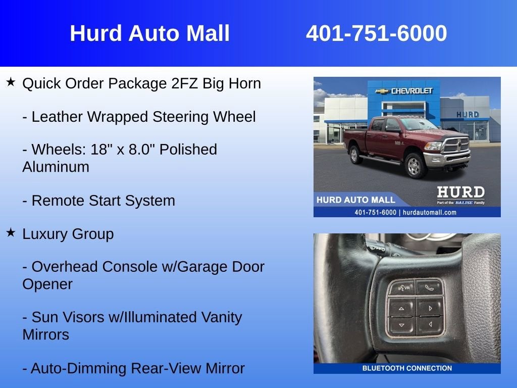 1-Year SiriusXM Radio Service, 4-Wheel Disc Brakes, 6 Speakers, ABS brakes, Air Conditioning ATC w/Dual Zone Control, Auto-Dimming Rear-View Mirror, Big Horn Badge, Big Horn Regional Package, Black MIC Exterior Mirrors, Brake assist, Bright/Bright Billets Grille, Clearance Lamps, Cold Weather Group, Dual front impact airbags, Dual front side impact airbags, Electroluminescent Instrument Cluster, Electronic Stability Control, Engine Block Heater, Fog Lamps, For More Info, Call 800-643-2112, Glove Box Lamp, Heavy Duty Snow Plow Prep Group, Leather Wrapped Steering Wheel, Luxury Group, Overhead Console w/Garage Door Opener, ParkSense Rear Park Assist System, ParkView Rear Back-Up Camera, Power Folding Black Trailer Tow Mirrors, Power-Folding Mirrors, Premium Cloth 40/20/40 Bench Seat, Quick Order Package 2FZ Big Horn, Rear Dome w/On/Off Switch Lamp, Remote Start System, SiriusXM Satellite Radio, Steering Wheel Mounted Audio Controls, Sun Visors w/Illuminated Vanity Mirrors, Traction control, Underhood Lamp, Wheels: 18 x 8.0 Polished Aluminum, Winter Front Grille Cover. Priced below KBB Fair Purchase Price!