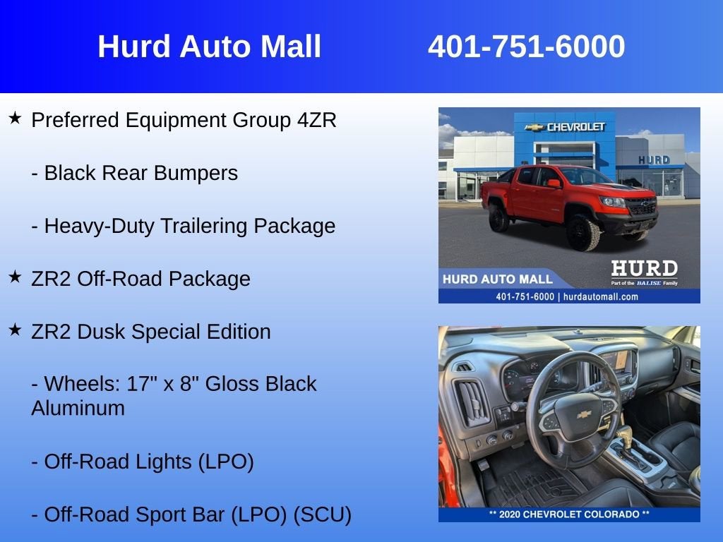 Local Trade, CERTIFIED, 4WD, 2 USB Data Ports w/SD Card Reader, 4-Wheel Disc Brakes, 6 Speakers, 6-Speaker Audio System Feature, ABS brakes, AM/FM radio: SiriusXM, Black Rear Bumpers, Black Spray-On Bedliner w/Chevrolet Logo, Bose Premium 7-Speaker Audio System Feature, Driver 6-Way Power Seat Adjuster, Driver-Selectable Full-Locking Front Differential, Driver-Selectable Full-Locking Rear Differential, Dual front impact airbags, Front License Plate Kit, Heated door mirrors, Heavy-Duty Trailering Package, Integrated Trailer Brake Controller, Occupant sensing airbag, Off-Road Lights (LPO), Off-Road Sport Bar (LPO) (SCU), Overhead airbag, Panic alarm, Power windows, Preferred Equipment Group 4ZR, Remote keyless entry, Security system, Speed-sensing steering, Steering wheel mounted audio controls, Traction control, Wheels: 17 x 8 Gloss Black Aluminum, ZR2 Dusk Special Edition, ZR2 Off-Road Package. Priced below KBB Fair Purchase Price!