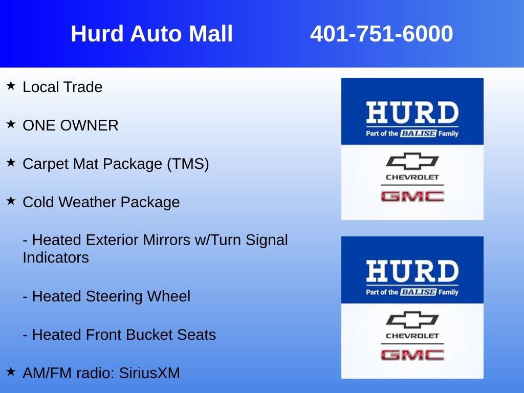 Local Trade, ONE OWNER, Unk Cloth, 4-Wheel Disc Brakes, ABS brakes, AM/FM radio: SiriusXM, Apple CarPlay/Android Auto, Auto High-beam Headlights, Automatic temperature control, Brake assist, Carpet Mat Package (TMS), Cold Weather Package, Driver vanity mirror, Dual front impact airbags, Dual front side impact airbags, Electronic Stability Control, Fully automatic headlights, Heated Exterior Mirrors w/Turn Signal Indicators, Heated Front Bucket Seats, Heated Steering Wheel, Power driver seat, Power steering, Rear window defroster, Security system, Speed control, Spoiler.